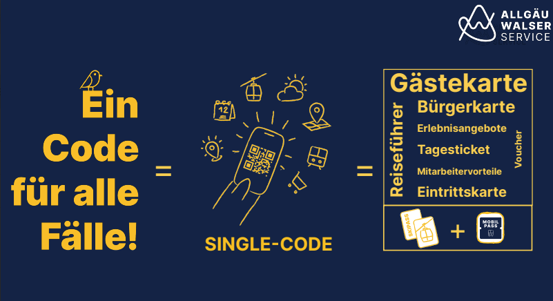 - Maximale Nutzerfreundlichkeit: Ein einziger Code für alles: Der Allgäu-Walser-Pass vereint ÖPNV-Ticket (eTicket Deutschland), Bergbahn-Ticket (Skidata), Eintritt zu Freizeiteinrichtungen (Bäder, Museen, Minigolf…), Parklösungen (Parkster usw.) und klassischen Gästepass in einer App.
