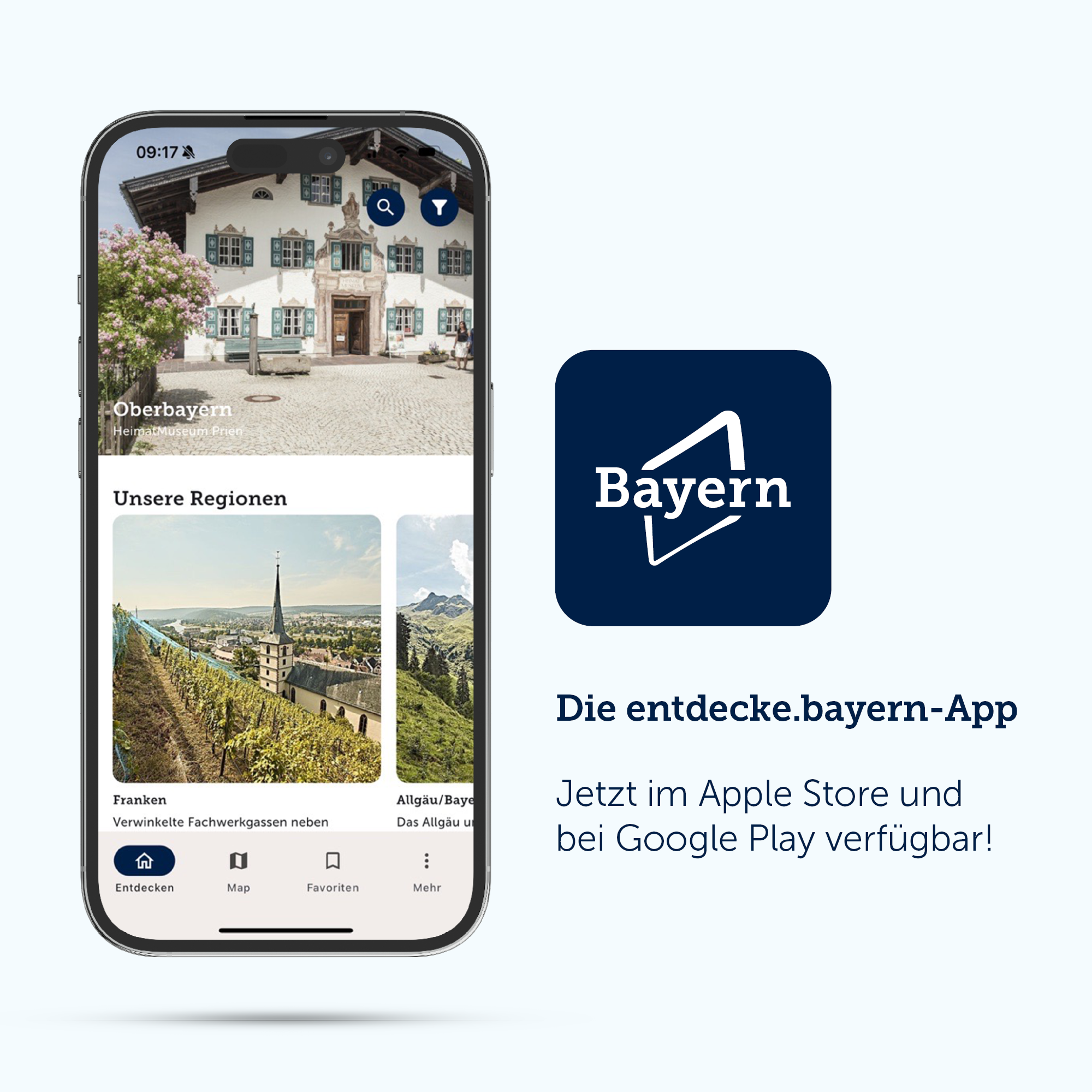 Die App ist ab sofort kostenfrei im Apple App Store und im Google Play Store erhältlich und wird kontinuierlich weiterentwickelt. Bis Ende des Jahres sind unter anderem großformatige Bildwelten, eine personalisierte Nutzeransprache sowie eine verbesserte Suchfunktion geplant. Darüber hinaus wird die App künftig redaktionell mit ausgewähltem Content aus dem Angebot von erlebe.bayern angereichert.